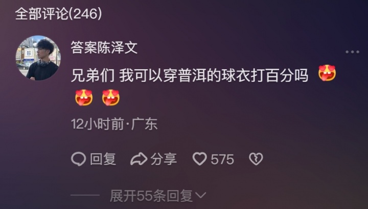 Chen Zewen himself replied in the official announcement video: "Brothers, can I wear Poole's jersey and score 100 points😍😍😍?"