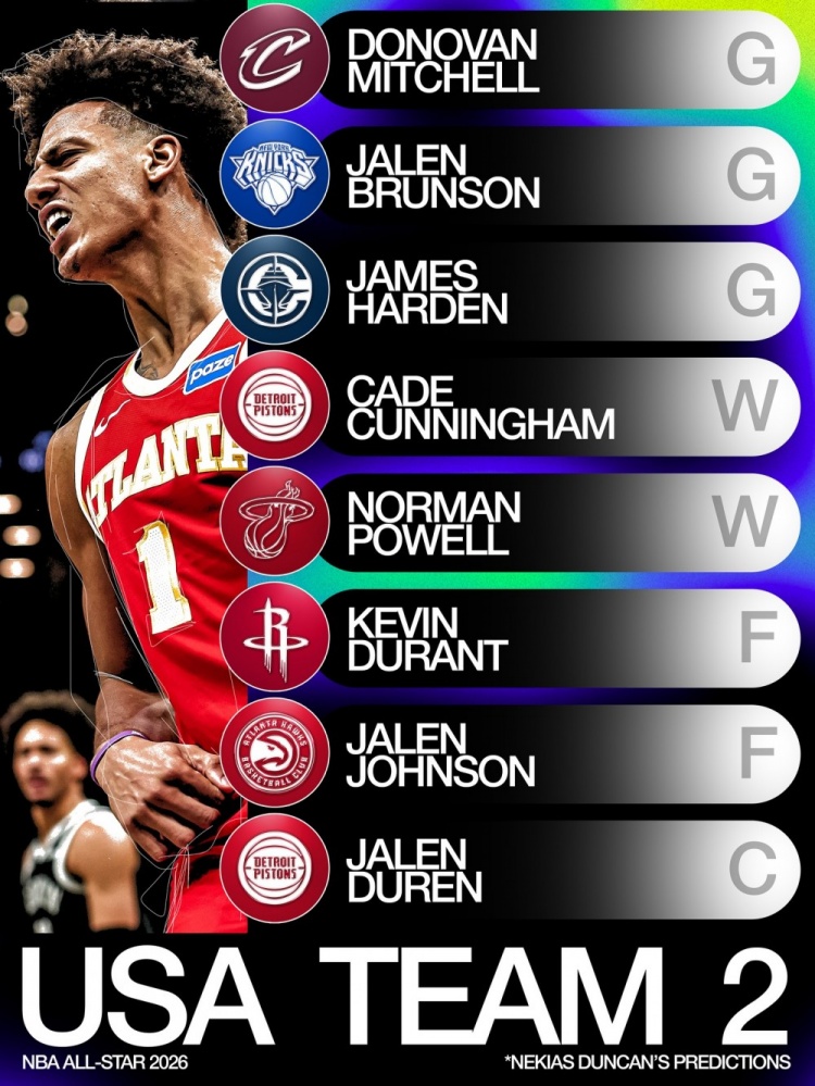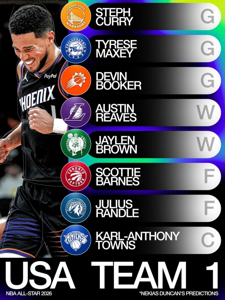 U.S. team (two teams): Curry, Maxey, Reeves, Jaylen Brown, Scotty Barnes, Randle, Towns, Mitchell, Brunson, Cunningham, Harden, Powell, Durant, Jaylen Johnson, Duren.