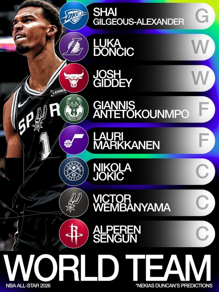 The world team is: Alexander, Doncic, Gidi, Antetokounmpo, Markkanen, Jokic, Bunyama, Shen Jing.