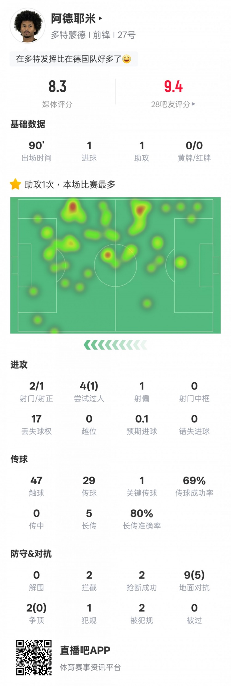 Adeyemi s data in this game: passes and shots + 1 out of the way and 1 key pass, rating of 8.3