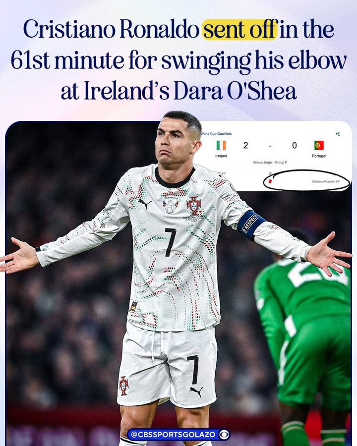 In the fifth round of Group F of the European Group Stage of the World Cup preliminaries, Portugal lost 0-2 to Ireland. Cristiano Ronaldo was sent off for an elbow. In the final round of the World Cup preliminaries, Portugal will play Armenia at home and Cristiano Ronaldo will be suspended.