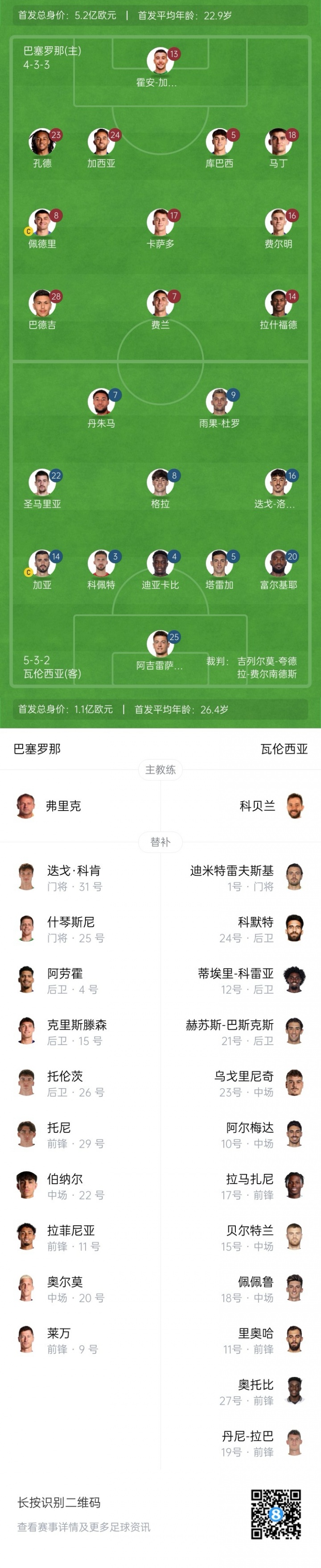 Barcelona substitutes: 25-Schchensny, 31-Diego Koken, 4-Arajo, 9-Lewand, 11-Rafinia, 15-Christensen, 20-Olmo, 22-Bernal, 26-Torentz, 27-Dro Fernandez