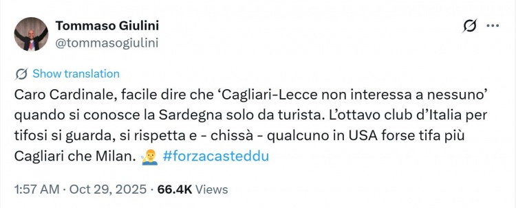 Giulini wrote : "Dear Cardinale, it's easy to say 'no one cares about Cagliari's game against Lecce' when all you know about Sardinia (where Cagliari's home stadium is) is from a tourist perspective. As the eighth-largest club in Italy by the number of fans, Cagliari is both watched and respected. And who knows, maybe more people support Cagliari than Milan in the United States (note: there are many descendants of Sardinian immigrants in the United States)."