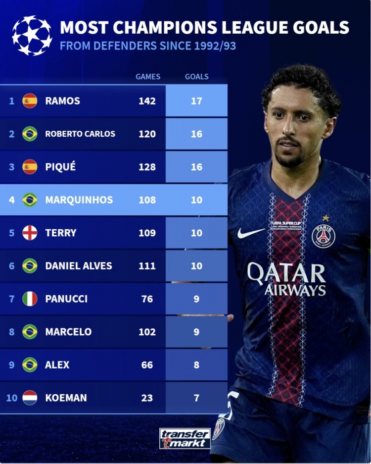 Germany transfer lists the Champions League defender goal list since the 1992-92 season, Ramos ranks first.