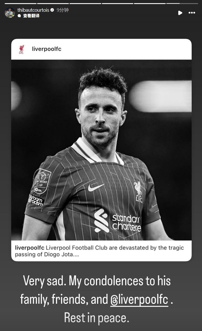 Real Madrid goalkeeper Courtois posted on Instagram to mourn Jota.