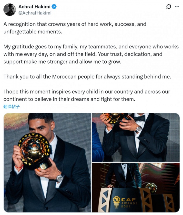 Ashraf was elected as the African Footballer of the Year in 2025. He posted photos of receiving the award on social media and gave an acceptance speech.