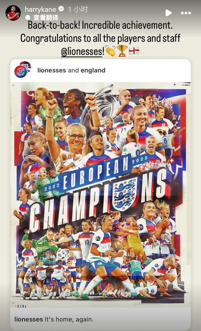 As the captain of the English men's football team, Bayern center Kane also reposted the poster of the English women's football team's championship through social media, and congratulated: "Defending champion! Extraordinary achievements! Congratulations to all the players and staff, @England Women's Football Team."