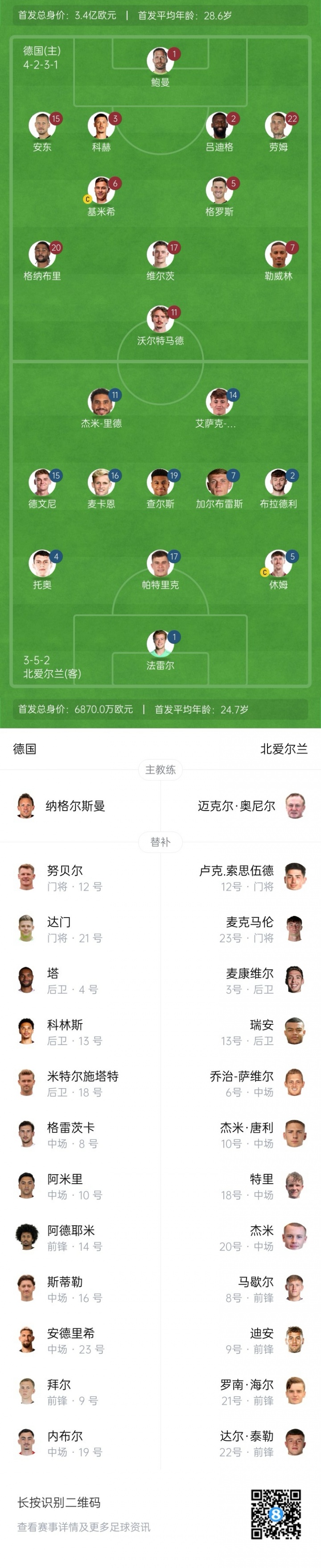 02:45, in the 6th round of Group A of the World Cup European qualifiers, Germany played against Northern Ireland at home, and the pre-match starting lineup was released!
