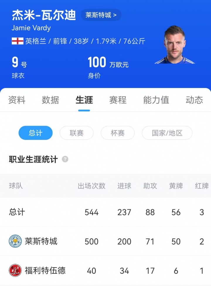 38-year-old Vardy devoted most of his career to Leicester City, making 500 appearances for Leicester, contributing 200 goals and 71 assists; and helped the team win the Premier League championship in the 15-16 season. This summer, Vardy's contract with Leicester City expired and became a free agent.