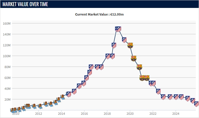 Germany transfer updated the value of players in La Liga yesterday. The 34-year-old Griezmann continued to fall, with 12 million euros left.