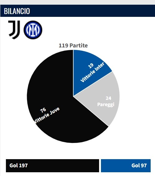Juventus historical record against Inter Milan: overall 110 wins, 60 draws and 70 losses, 76 wins, 24 draws and 19 losses at home