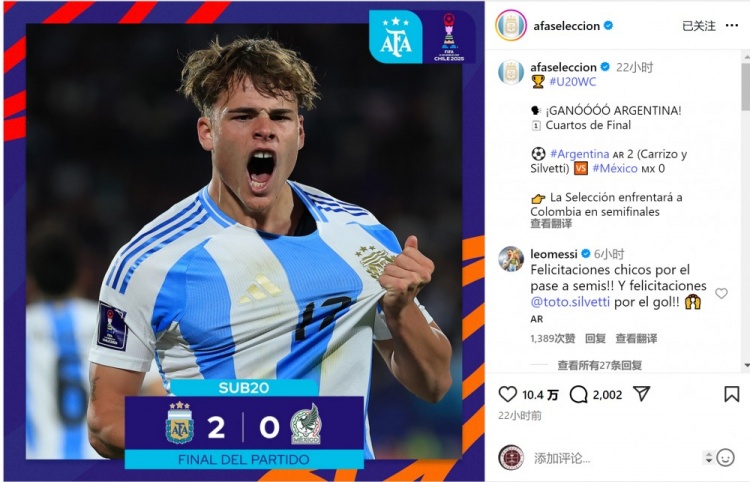 The Argentina team posted a poster on social media to celebrate their promotion. Messi left a message: "Congratulations to the boys for advancing to the semi-finals, and congratulations to Silveti for scoring the goal!"