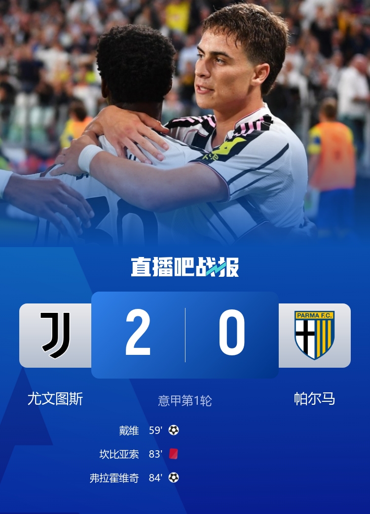 David won Juventus' first goal in the main game, Vlahovic scored a substitute, and Cambiaso's revenge action was red. In the end, the ten players Juventus defeated Parma 2-0 at home.