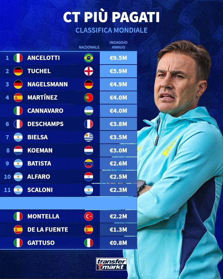 National team coach salary ranking: Anshuai ranked first with 9.5 million euros, Cannavaro ranked fourth with 4 million euros