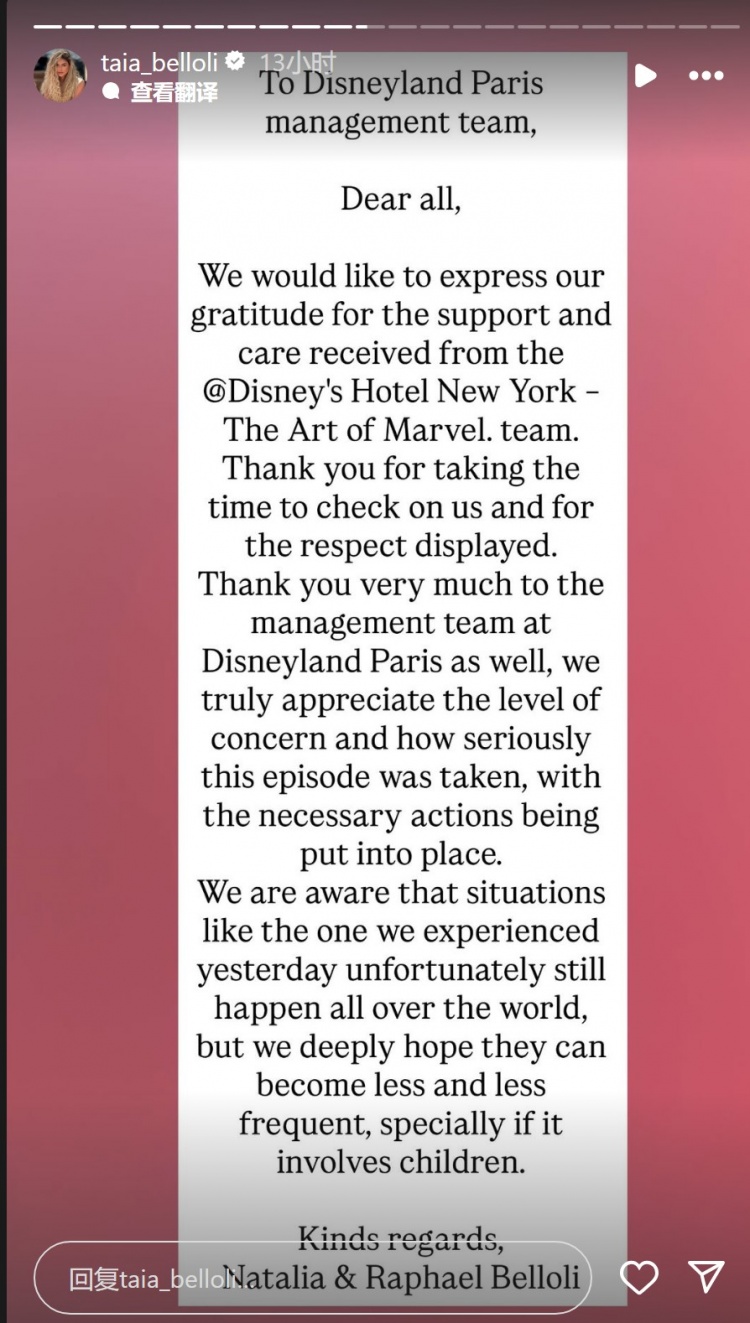 "To Disneyland Paris Management Team, dear, we express our gratitude to the Disney Hotel New York-Marvel Arts for your support and care. Thank you for taking the time to care for us and showing respect. We also very much thank you for the management team at Disneyland Paris. We sincerely appreciate your attention to this incident and the necessary measures taken.