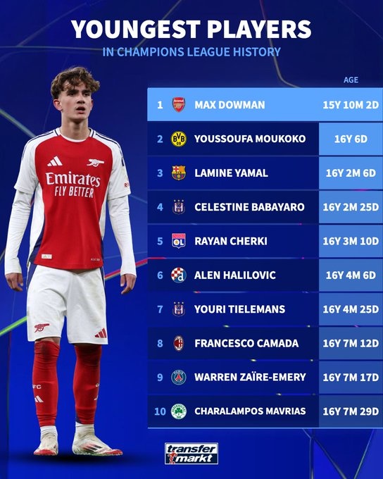 In the fourth round of the UEFA Champions League, Arsenal defeated Slavia Prague 3-0 away from home. In this game, Arsenal's 15-year-old Dauman came on as a substitute and became the youngest player to appear in the Champions League history.