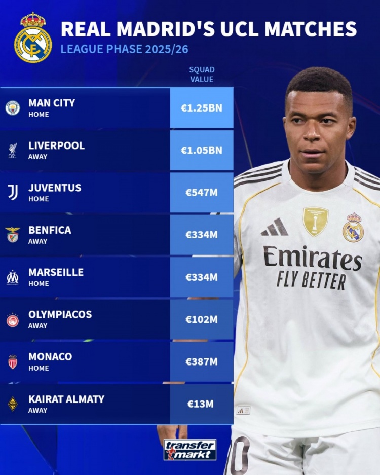 The draw results of this season's Champions League stage are released, and the German transfer market lists the value of Real Madrid's opponents.