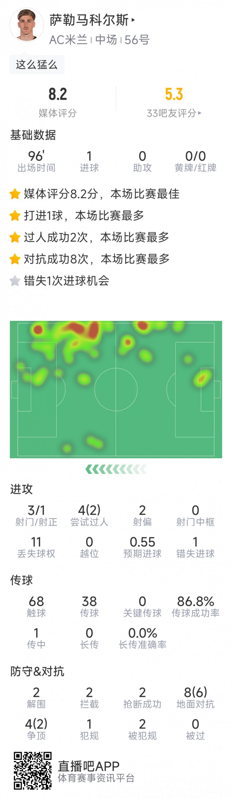 In this round of Serie A, AC Milan drew 2-2 with Parma. The following are the statistics of Salle Marcos: