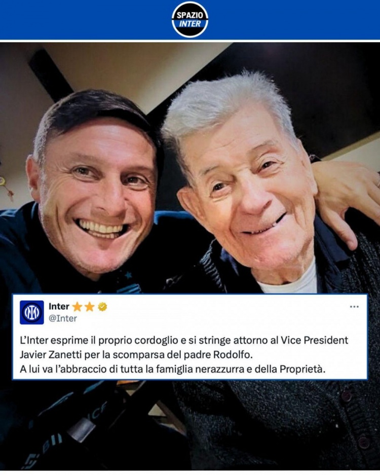 Inter Milan official wrote: "Inter Milan extends sincere condolences to Vice Chairman Zanetti, and his father Rodolfo passed away. The entire Inter Milan family and club owners are in love with him during this difficult time."