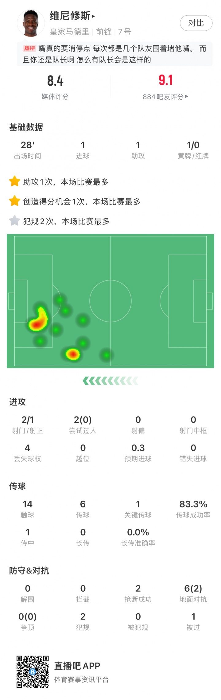 In the second round of La Liga, Real Madrid 3-0 Oviedo, Vinicius made a substitute in the 63rd minute and passed and scored.