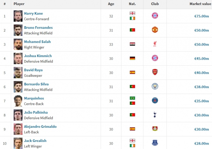 Value list of players over 30 years old: 32-year-old Kane ranks first with 75 million euros, followed by B Fe Salah with 50 million euros