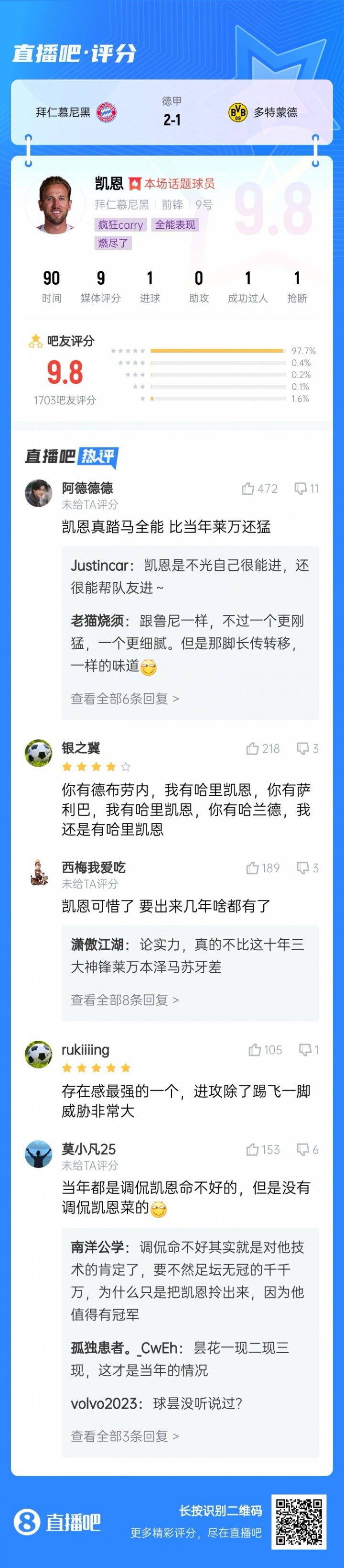 The results of the seventh round of selection were released. Kane scored 1 goal + organization and key defense to help Bayern defeat Dortmund 2-1 and take pride in the national derby. In the end, Kane received more than 70,000 votes from netizens and was elected [Best Player of the 7th Round of X Xiaohongshu Bundesliga]!